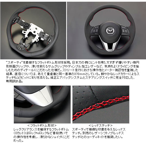 □商品詳細本革製 グリップ部ディンプル加工直径370mmフラットボトム・レッドステッチ純正エアバッグ/ステアリングスイッチに対応。