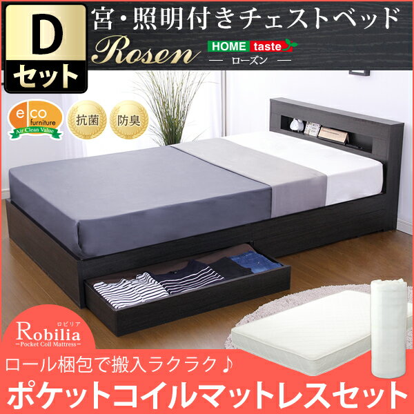 宮、照明付きチェストベッド【ローズン-ROSEN-(ダブル)】(ロール梱包のポケットコイルスプリングマットレス付き)(代引き不可)