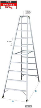 ※写真の脚立はSWH-30です 天板幅広強力型 3枚構成の幅広天板 350mmX300mmは脚立では 最大面積です(当社) 大型支柱端具 収納時に脚部の左右のズレを防ぐ 凹凸のミゾつき 型式 天板高さ (m) 重量 (kg) 設置寸法(外寸)(cm) 収納寸法(外寸)(cm) W全幅 D奥行 全幅 奥行 高さ SWH-09 0.90 6.3 53 96 53 30 104 SWH-12 1.20 7.6 58 117 58 30 135 SWH-15 1.50 8.9 64 139 64 30 167 SWH-18 1.80 10.6 69 160 69 30 199 SWH-21 2.10 12.9 75 184 75 30 231 SWH-24 2.40 15.1 81 204 81 30 262 SWH-27 2.70 17.7 86 227 86 30 294 SWH-30 3.00 20.0 92 249 92 30 326 ※サイズ・在庫の関係上、メーカーから直送の商品もあります アルミの特性 FRPの特性 アルマイトの特性 中折れ式 比重が鉄の約1/3と軽く、耐久性や加工性にも優れています。
