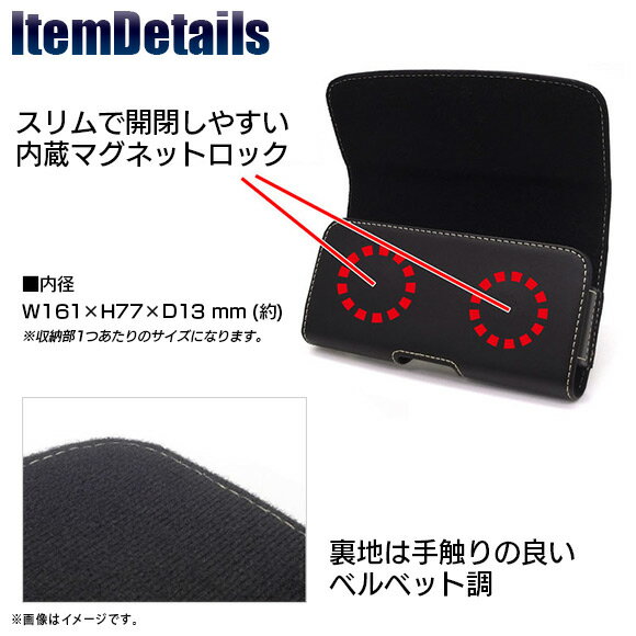 【スマートフォン2台を収納可能!固定式ベルトクリップ ・ 内蔵マグネットロック採用のベルトケース】 ●スマートフォン2台を収納OK! →収納しやすいよう、仕切りによって収納部を2ポケットに分割 ●固定式ベルトクリップ&脱落防止ストッパーの安心ダブルロック ●ベルトをはずさずにスムーズに脱着 ●開閉しやすいマグネットロック マグネットの磁気が本体に影響しないアンチ・マグネットロック スリムなマグネットボタン内蔵タイプ ●カード収納ポケット付(1枚) ●裏地は手触りの良いベルベット調 内寸:H 77 × W 161 × D 13 mm (約) × 2ポケット 外寸:H 88 × W 170 × D 36 mm (約) ※クリップを除く 重さ:156グラム 収納確認機種(例)※ハードカバーやシリコンケース等を装着していない状態で収納確認を行っています iPhone 8 Plus・iPhone X・Galaxy S8+・AQUOS R・V30+・Xperia XZ1・Xperia XZ Premium SO-04J・arrows NX F-01K・ZenFone 3 Deluxe ZS550KL